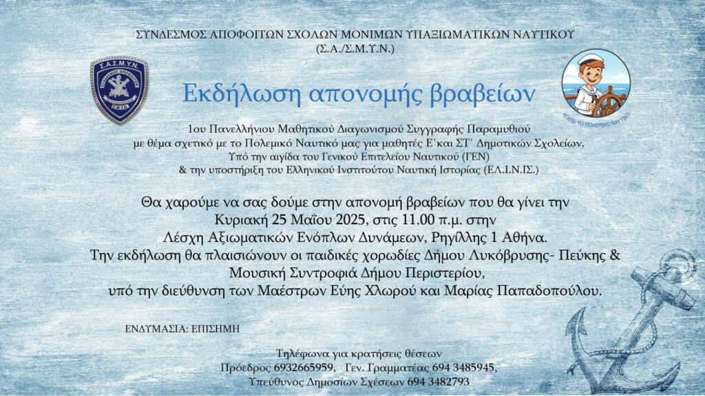 Ανακοίνωση Αποτελεσμάτων του Πρώτου Πανελλήνιου Μαθητικού Διαγωνισμού Παραμυθιού με θέμα το “Πολεμικό Ναυτικό” !
