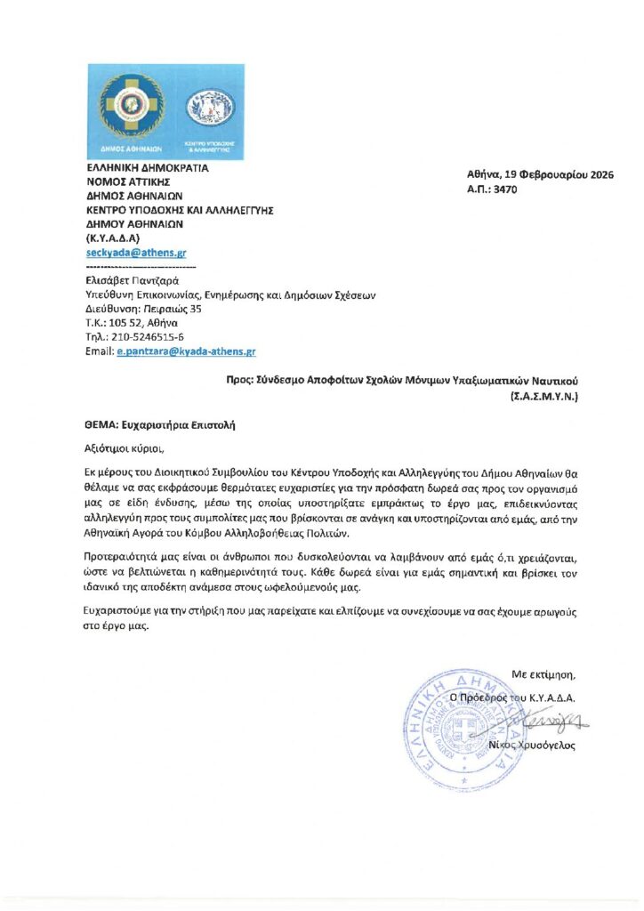 Την Πέμπτη 19 Φεβρουαρίου 2026 λάβαμε από το Κέντρο Υποδοχής και Αλληλεγγύης Δήμου Αθηναίων, την παρακάτω επιστολή:
